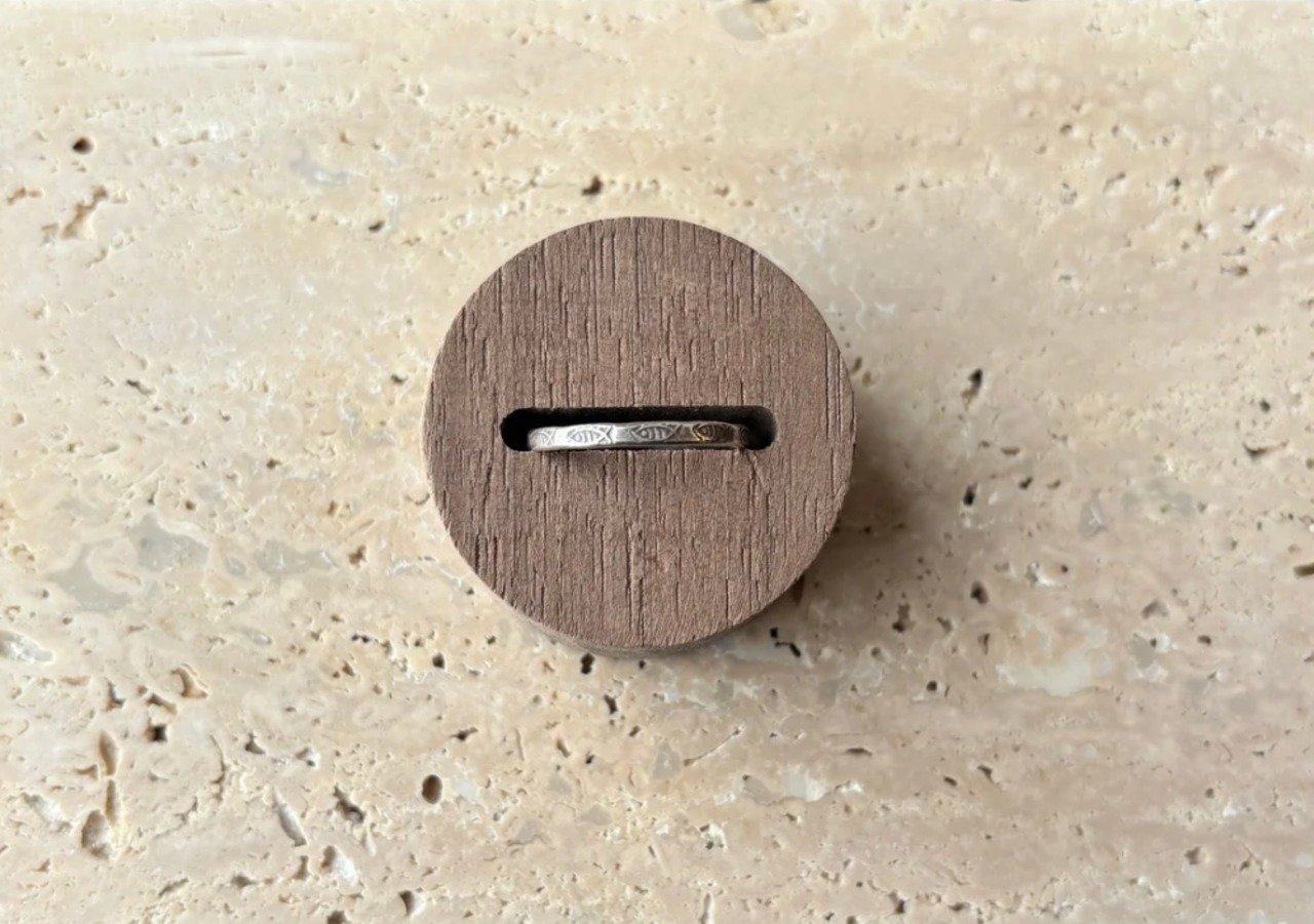 細やかな技法で仕上げられたこのリングは、シンプルながらも存在感があり、