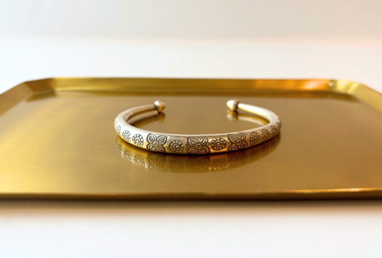 細やかな技法で仕上げられたこのブレスレットは、シンプルながらも存在感があり、